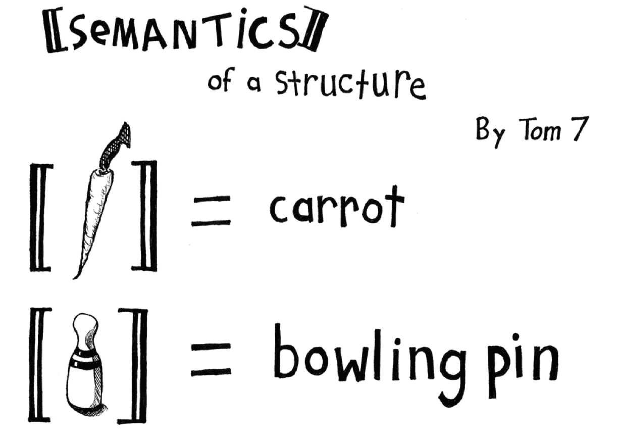 We define a (compilation) function \(\lbrack\!\lbrack\cdot \rbrack\!\rbrack\) on syntax to its denotation. A denotation is something in the meta logic (e.g., sets, functions, partial-ordered sets, complete lattices, monotone functions, continuous functions).